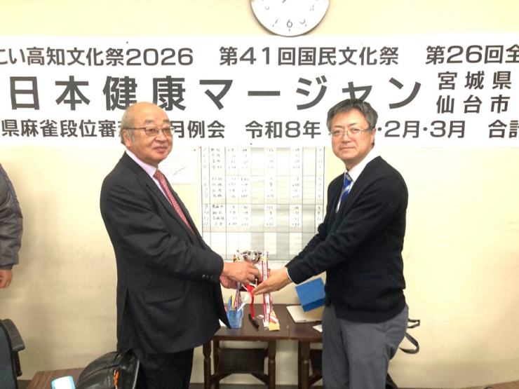 令和7年度第二回麻雀大会(11月13日)が開催されました 2025/11/18 so.syo.arai 第二回麻雀大会(令和7年11月13日)の報告 今年度第二回麻雀大会が、開催されました。今回は、12名参加の大会でしたが、 3回戦の熱い戦いが繰り広げられました。 優勝は、沼倉和彦氏で、2回目の優勝もパーフェクト(3回連続トップ)での 優勝でした。沼倉様、まことにあめでとうございました。 前回優勝者の佐藤氏(右)から今回優勝者沼倉氏へカップお渡し(071113) 優勝した沼倉氏(071113)