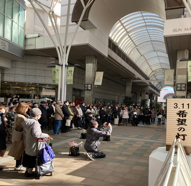 日頃より、会活動へご支援をいただき、まことにありがとうございます。 3月11日、東日本大震災後15年の追悼行事を、商店街と連携し、 一番町ぶらんど~む商店街にて開催いたしました。 15年の節目ということもあり、昨年より、多くの皆様が追悼においでになりました。 お集まりになった方全員で14時46分に黙祷を行い、追悼の意をお伝えしました。 黙祷前後には、地元ミュージシャンによる鎮魂の演奏があり、それぞれの思いで この日を迎えました。お忙しい中、献花においでいただいた会員の皆様方、ありがとうございました。
